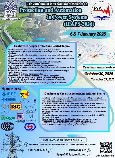 The 20th annual international conference on “Protection and Automation in Power Systems” (IPAPS 2026) will be held on January 6 and 7, 2026 by the School of Electrical and Computer Engineering of the Shiraz University, Shiraz, Iran. This conference provides a valuable opportunity for academic researchers and industry engineers to present their latest and most important achievements. The conference will feature general sessions, technical meetings, key lectures, presentations, posters, and training workshops. Therefore, with the aim of gathering industry and academic experts, exchanging knowledge, and building a network of experts and researchers in the field of power systems protection and automation, the conference will be held in person.